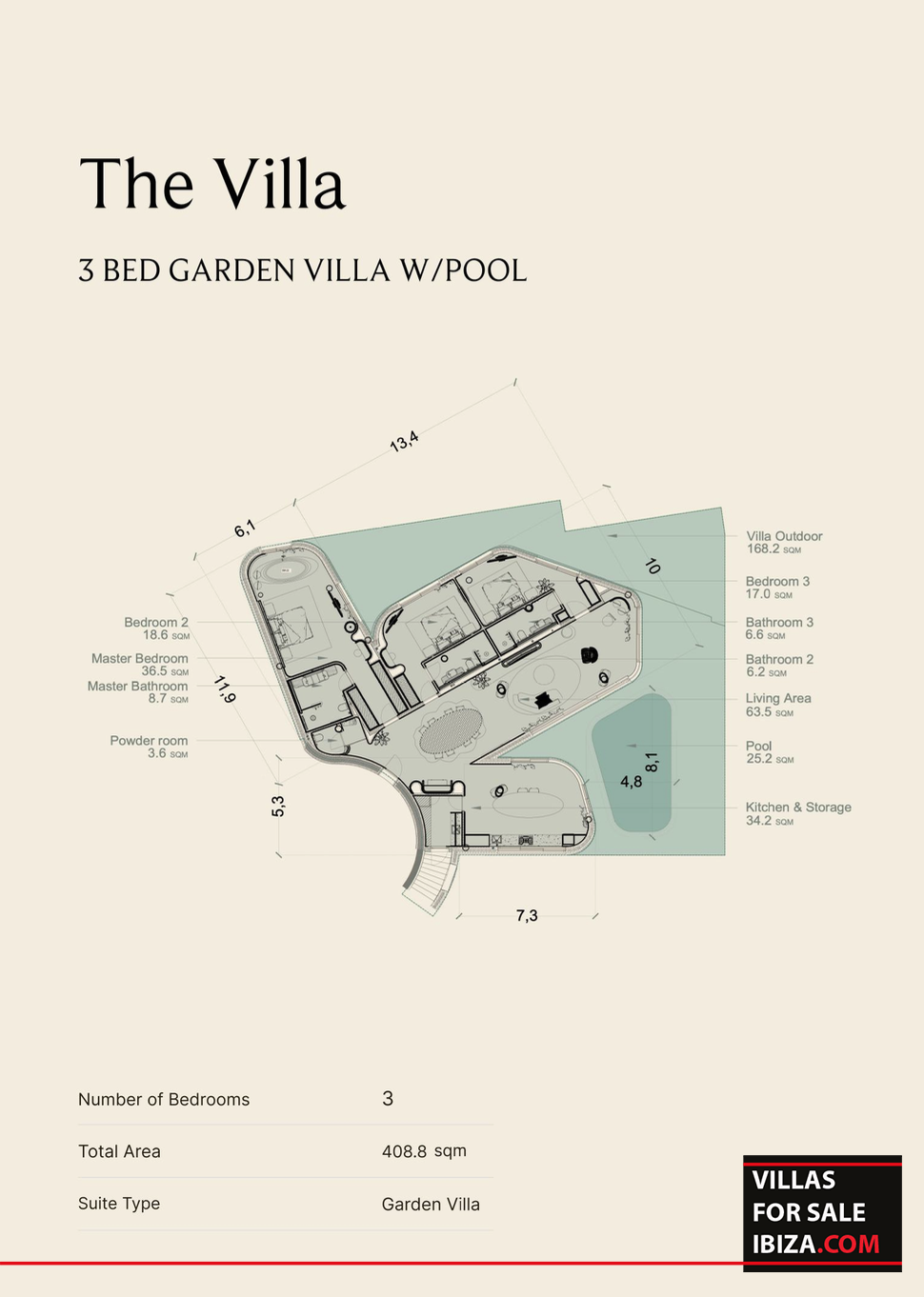 This exclusive villa is the only standalone residence within the development, offering three spacious bedrooms, all en suite, designed with a refined Mediterranean aesthetic and high-end materials such as microcement, natural stone and travertine.