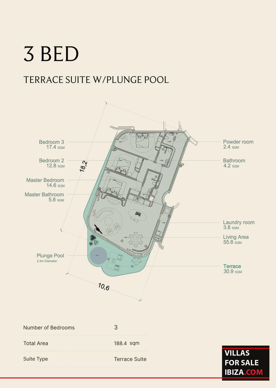 Each residence features a fully equipped designer kitchen, a generous open-plan living and dining area, and three well-appointed bedrooms, ideal for both family living and entertaining. Large sliding doors open onto a spacious private terrace with its own plunge pool, creating a seamless connection between interior and exterior spaces.